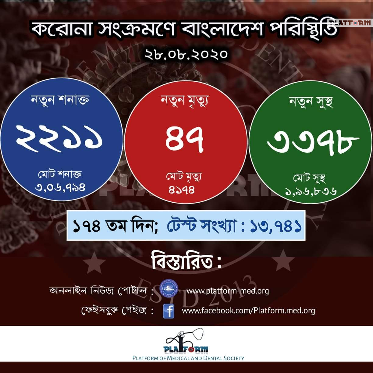 গত ২৪ ঘণ্টায় বাংলাদেশে কোভিড-১৯ এ নতুন করে শনাক্ত হয়েছেন ২,২১১ জন, মৃত্যুবরণ করেছেন আরো ৪৭ জন এবং আরোগ্য লাভ করেছেন ৩,৩৭৮ জন। এ নিয়ে দেশে মোট শনাক্ত রোগী ৩,০৬,৭৯৪ জন, মোট মৃতের সংখ্যা ৪,১৭৪ জন এবং সুস্থ হয়েছেন মোট ১,৯৬,৮৩৬ জন।