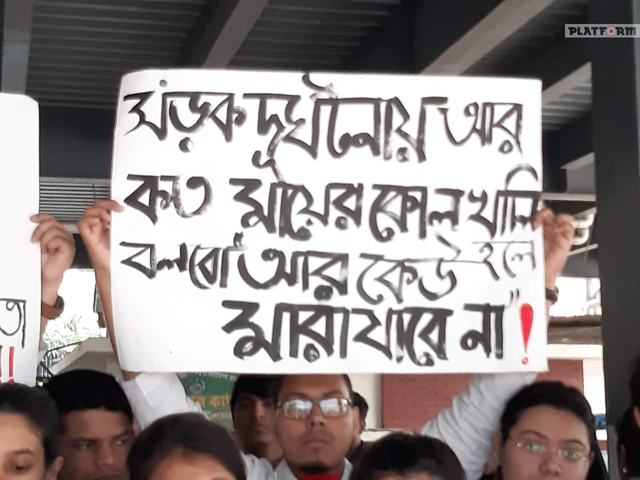 জানা গেছে, দুপুর বারোটার দিকে মেডিকেল কলেজের সামনের ধানমন্ডি-৮ নম্বর সড়কে মানববন্ধন করেন শিক্ষার্থীরা। এতে শিক্ষকরাও সংহতি প্রকাশ করে যোগ দেন। আধাঘণ্টা ব্যাপী এ বিক্ষোভে কয়েকশ শিক্ষার্থী অংশগ্রহণ করেন।