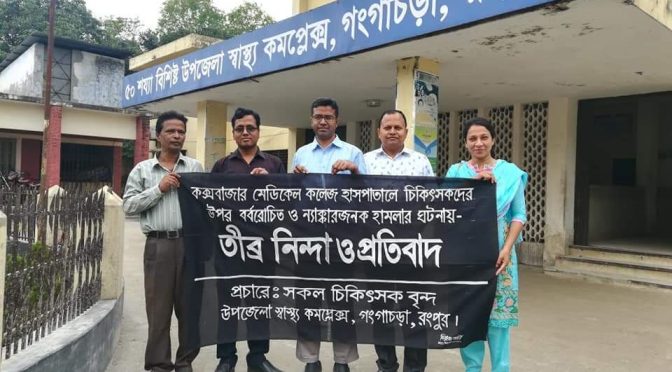 দেশের প্রান্ত থেকে প্রতিবাদ কক্সবাজারের চিকিৎসকদের উপর বর্বোরোচিত ও ন্যাক্কারজনক হামলার প্রতিবাদে সোচ্চার দেশের বিভিন্ন প্রাপ্তে থাকা সকল স্তরের চিকিৎসক এবং নার্স তথা স্বাস্থ্য সেবার উন্নয়নের পক্ষের সকল মানুষ! রংপুরের গংগাচড়ায় স্বাস্থ্য কমপ্লেক্স থেকে প্রতিবাদ ও নিন্দা জানায় চিকিৎসকরা! ছবি পাঠিয়েছেনঃ Dr.Hamidul Islam Jr.Consultant(Surgery) UHC,Gangachara.Rangpur DjMC 6th Batch