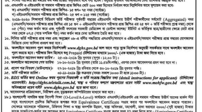 গণপ্রজাতন্ত্রী বাংলাদেশ সরকারের স্বাস্থ্য অধিদপ্তরের পক্ষ থেকে ২০১৯-২০ শিক্ষাবর্ষে বিডিএস কোর্সে ভর্তি বিজ্ঞপ্তি প্রদান করা হয়েছে। আগামী ০১ নভেম্বর ২০১৯, শুক্রবার, সকাল ১০ টায় ভর্তি পরীক্ষা অনুষ্ঠিত হবে। বর্তমানে বিডিএস আবেদনের যোগ্যতাঃ ২০১৬ বা ২০১৭ সালে এসএসসি এবং ২০১৮ না ২০১৯ সালে এইচএসসি এ উত্তীর্ণ এবং দুই পরীক্ষায় মোট জিপিএ […]