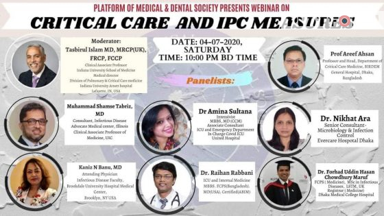 গত ৪ জুলাই শনিবার, প্ল্যাটফর্ম কর্তৃক আয়োজিত কোভিড-১৯ সম্পর্কিত ওয়েবিনার সিরিজের ৩য় পর্ব অনুষ্ঠিত হয়। উক্ত ওয়েবিনারে কোভিড-১৯ এবং এ সময়ের ক্রিটিকাল কেয়ার নিয়ে বিস্তারিতভাবে বিজ্ঞ আলোচকেরা কথা বলেন। এছাড়া দেশব্যাপী জুনিয়র ডাক্তার এবং মেডিক্যাল স্টুডেন্টদের এই সংক্রান্ত নানা প্রশ্নের জবাব দেন বিশেষজ্ঞরা।