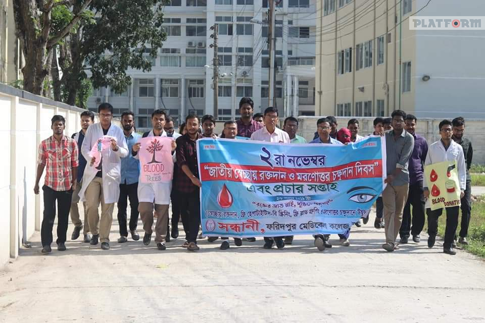 ২রা নভেম্বর “জাতীয় স্বেচ্ছায় রক্তদান ও মরণোত্তর চক্ষুদান দিবস এবং প্রচার সপ্তাহ(২-৮ নভেম্বর)-২০১৯” উপলক্ষে সপ্তাহব্যাপী কার্যক্রমের প্রথম দিনে সন্ধানী,ফরিদপুর মেডিকেল কলেজ ইউনিট কতৃর্ক ফরিদপুর মেডিকেল কলেজ এবং হসপিটাল প্রাঙ্গনে র্যালি,স্বেচ্ছায় রক্তদান কর্মসূচি এবং ফ্রি ব্লাড গ্রুপিং,মরণোত্তর চক্ষুদানে উদ্বুদ্ধকরণ,”জাতীয় স্বেচ্ছায় রক্তদান ও মরণোত্তর চক্ষুদান দিবস-২০১৯” উপলক্ষে প্রকাশিত বিশেষ পত্রিকা ‘অরুণ’ এর মোড়ক উন্মোচন এবং সন্ধানীর কার্যক্রম সম্পর্কে লিফলেট বিতরণ করা হয়।