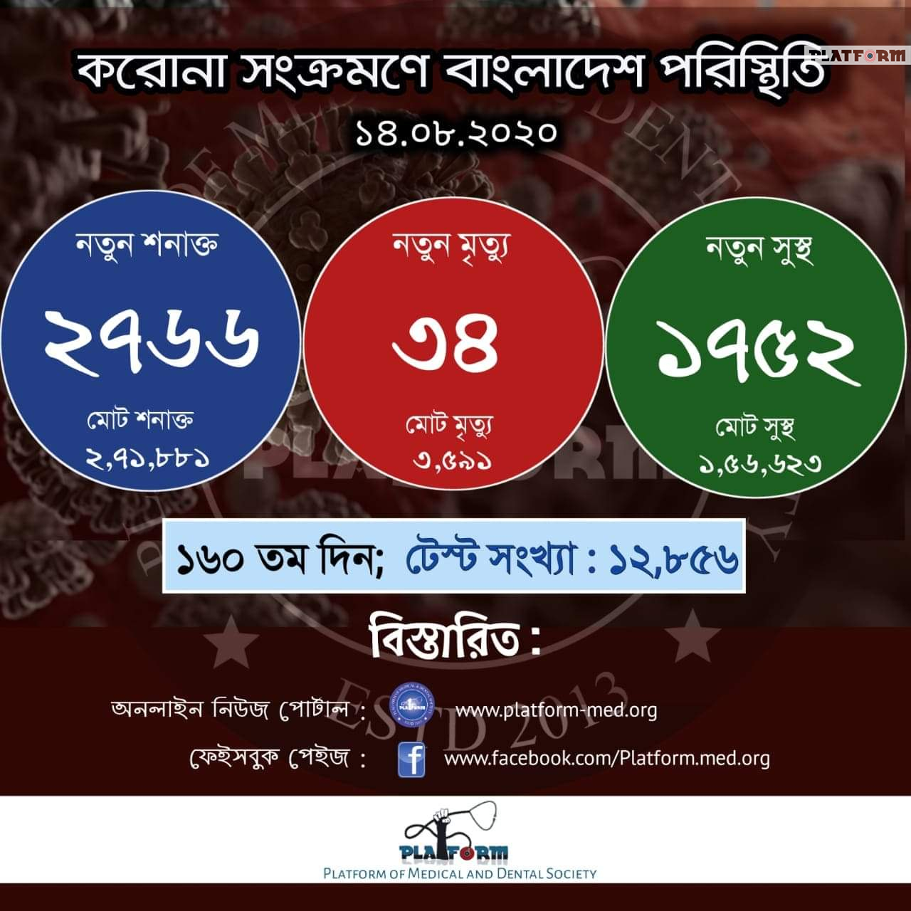 প্ল্যাটফর্ম নিউজ, শুক্রবার, ১৪ আগস্ট, ২০২০ গত ২৪ ঘণ্টায় বাংলাদেশে কোভিড-১৯ এ নতুন করে শনাক্ত হয়েছেন ২,৭৬৬ জন, মৃত্যুবরণ করেছেন আরো ৩৪ জন এবং আরোগ্য লাভ করেছেন ১,৭৫২ জন। এ নিয়ে দেশে মোট শনাক্ত রোগী ২,৭১,৮৮১ জন, মোট মৃতের সংখ্যা ৩,৫৯১ জন এবং সুস্থ হয়েছেন মোট ১,৫৬,৬২৩ জন। স্বাস্থ্য অধিদপ্তরের […]