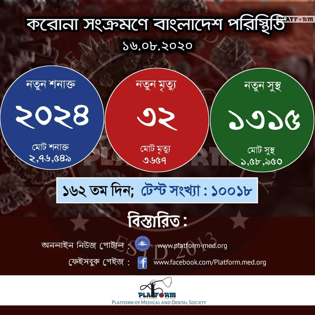 প্ল্যাটফর্ম নিউজ, শুক্রবার, ২১ আগস্ট, ২০২০ গত ২৪ ঘণ্টায় বাংলাদেশে কোভিড-১৯ এ নতুন করে শনাক্ত হয়েছেন ২,৪০১ জন, মৃত্যুবরণ করেছেন আরো ৩৯ জন এবং আরোগ্য লাভ করেছেন ৩,৬২৪ জন। এ নিয়ে দেশে মোট শনাক্ত রোগী ২,৯০,৩৬০ জন, মোট মৃতের সংখ্যা ৩,৮৬১ জন এবং সুস্থ হয়েছেন মোট ১,৭৩,৬১৫ জন। স্বাস্থ্য অধিদপ্তরের […]