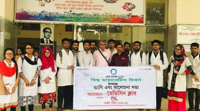 ১৪ই নভেম্বর ‘বিশ্ব ডায়াবেটিস দিবস’। ‘ডায়াবেটিস প্রতিটি পরিবারের উদ্বেগ’ এই প্রতিপাদ্য সামনে রেখে গণপ্রজাতন্ত্রী বাংলাদেশ সরকারের উদ্যোগে সারাদেশব্যাপী নানা কর্মসূচীর মাধ্যমে পালিত হয়েছে ‘বিশ্ব ডায়াবেটিস দিবস ২০১৮’ । মেডিকেল ও ডেন্টাল শিক্ষার্থীদের দ্বারা পরিচালিত স্বেচ্ছাসেবী সংগঠন “মেডিসিন ক্লাব” সারা দেশব্যাপী তাদের সকল ইউনিট সমুহে একযোগে ডায়াবেটিস সচেতনতা লিফলেট বিতরণ, ডায়াবেটিস […]